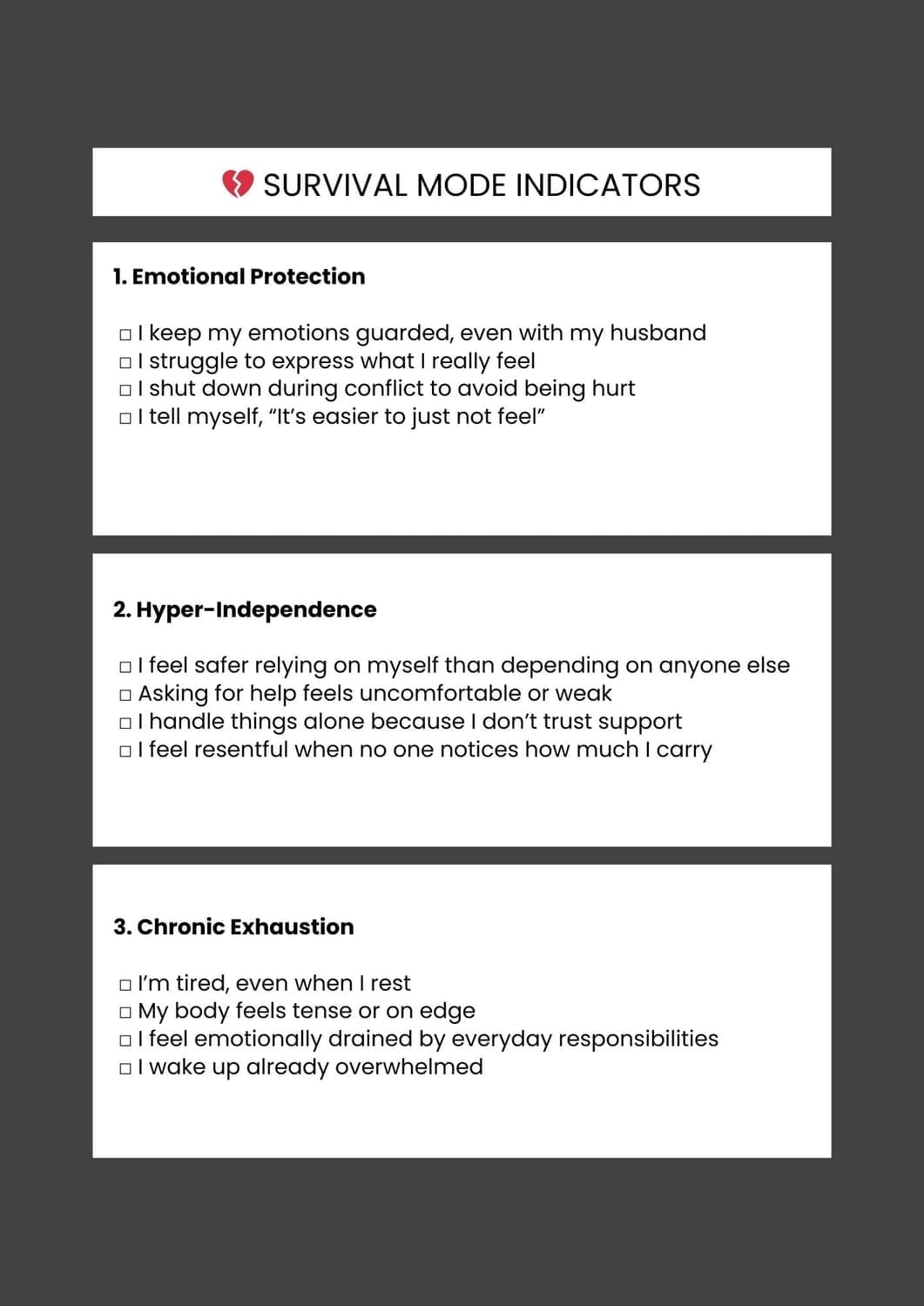 Created to accompany Restoring Her Heart: Grace for the Healing Wife, this free assessment helps you reflect on how survival patterns may be impacting your heart and your marriage—while pointing you toward hope, grace, and restoration.